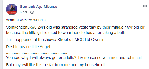 Facebok user, Somack Aju Mbaise who shared the story said the incident occurred at Ihechiowa Street off MCC Rd in Owerri, Imo State.
